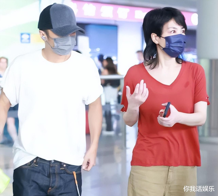而王菲身穿一件红色的短袖衣服,她戴着一个口罩,看起来精神状态良好。